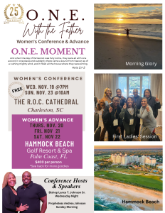 Includes your O.N.E. Swag Bag, General Sessions, Small Breakthrough Seminars, Throne Room Experience, Thursday Pajama Party with Snack Bar, Morning Glory on the Beach, Friday Breakfast Buffet, & Friday Night Dinner Party, TWO SPECIAL O.N.E. with Father Monogrammed Gifts, and experience with GOD and your sisters in Christ you will never forget!